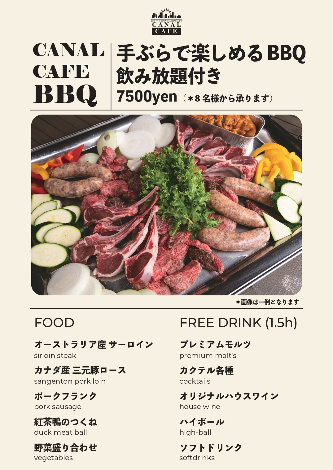 都心の水辺で、手ぶらでできる BBQ プラン。 MENU ※クリックで拡大しますメニューは一例となります。内容は日々変更しておりますので予めご了承ください。 BBQ についてのご案内 BBQ のご利用は事前にご予約が必要となります。(完全予約制) BBQは8名様からのご案内となります。 お一人様7500円(税込)の1プランのご用意となります。(食材+フリードリンク90分) ご予約の際、内金を頂戴しております。内金を頂いた時点で予約確定とさせていただき、確定後キャンセルとなった場合は内金全額をキャンセル料とさせていただきます。 BBQ 場には開閉式の屋根が設置してあります。 原則雨天決行となりますが、台風など荒天の場合はご案内出来ない可能性もございます。予めご了承ください。人数変更等はご来店日の3日前まで承っております。 内金振込先 振込先銀行 ・・・ 三井住友銀行支店名 ・・・ 飯田橋支店口座番号 ・・・ 普通 7178630振込先名義 ・・・ 有限会社東京水上倶楽部 ユ)トウキョウスイジョウクラブ